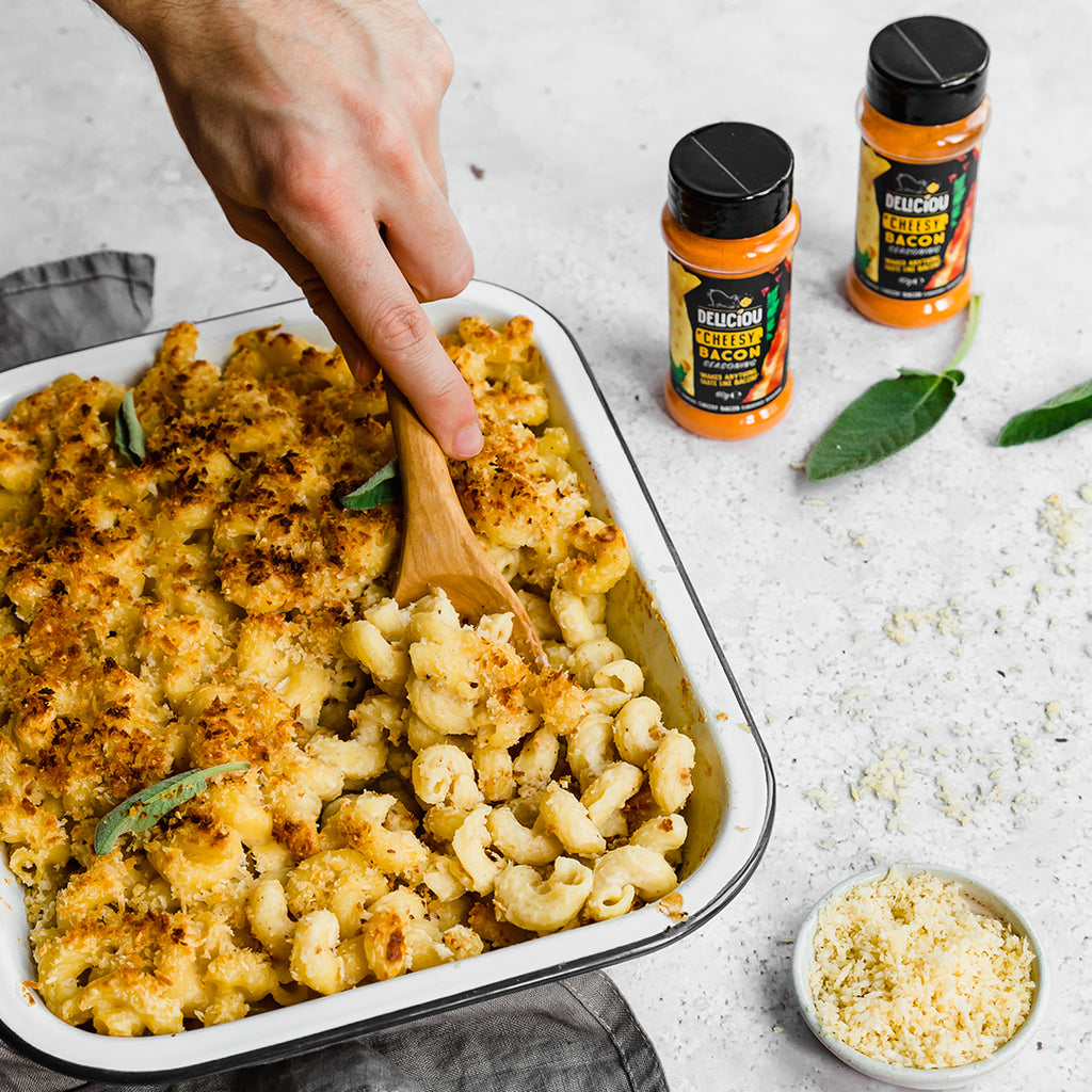 5. In a small bowl, stir the breadcrumbs with 2 tsp oil and 1 tsp Deliciou Cheesy Bacon Seasoning. Scatter over the top of the macaroni & bake for 15 mins until piping hot & crisp. Enjoy!