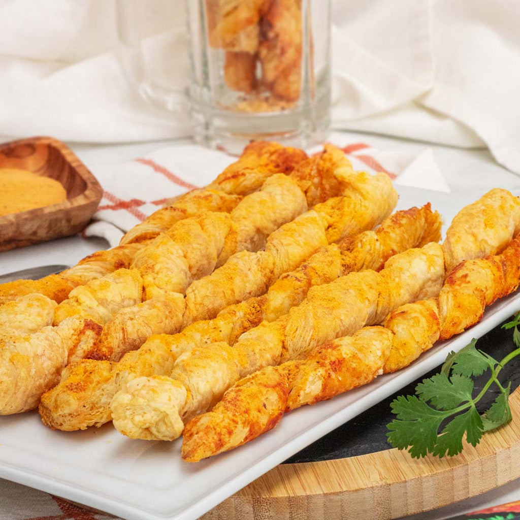 - Lifting the pastry strips off the plastic sheet, hold the short ends and twist the strips so bacon seasoning is on the inside, creating a long twist. Lay on trays with space between each strip.