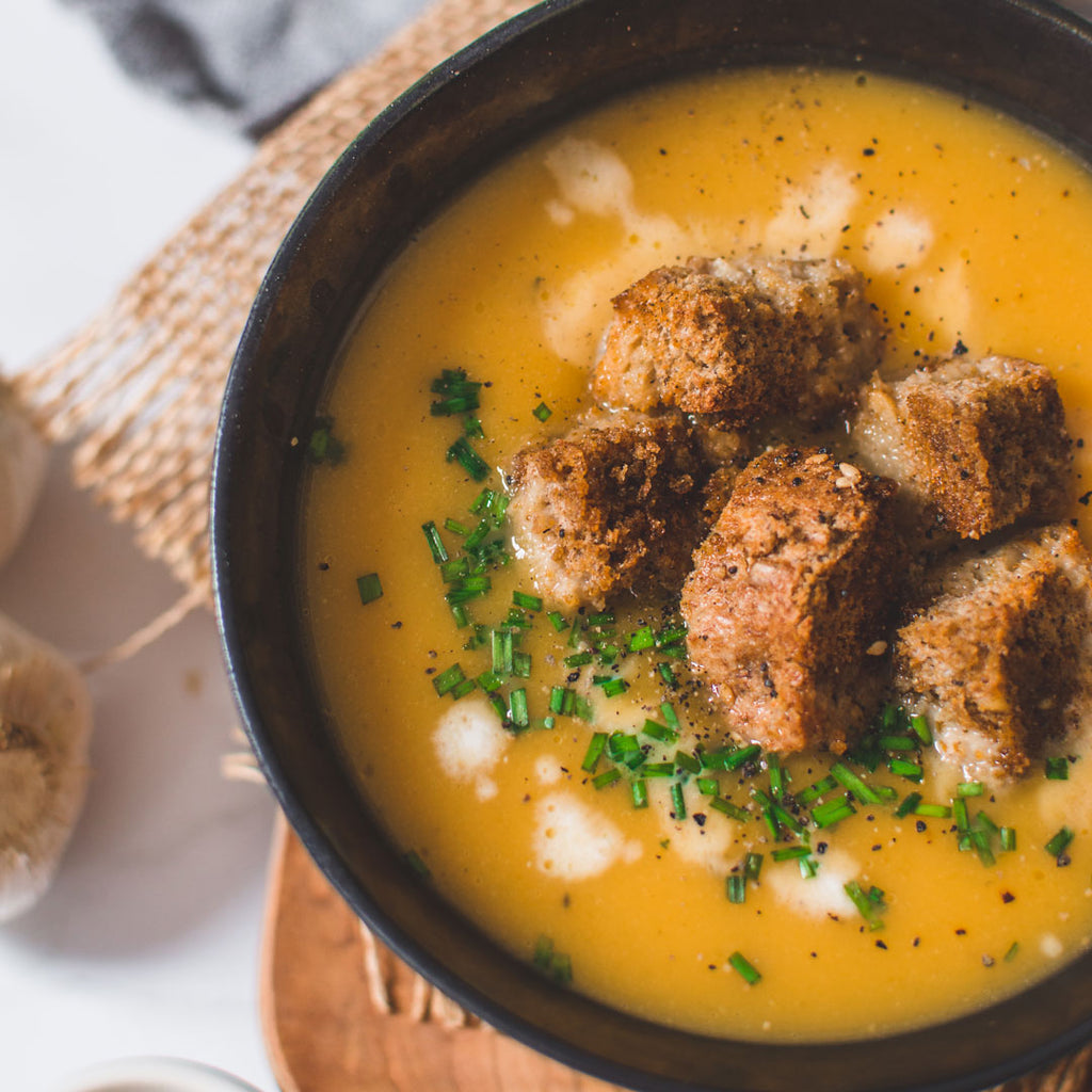 Creamy, hearty and healthy, this pumpkin soup is our go-to for those chilly nights. Topped with crispy bacon croutons, this is a sure fire way to warm yourself up and satisfy your hunger.