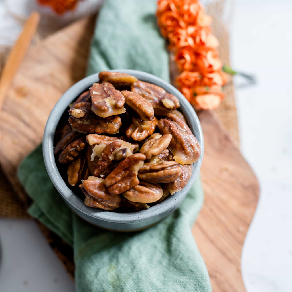2. Add in the pecans and stir to coat. Transfer to a lined baking tray in one layer and allow to cool. Crush and add to baking or eat as is!