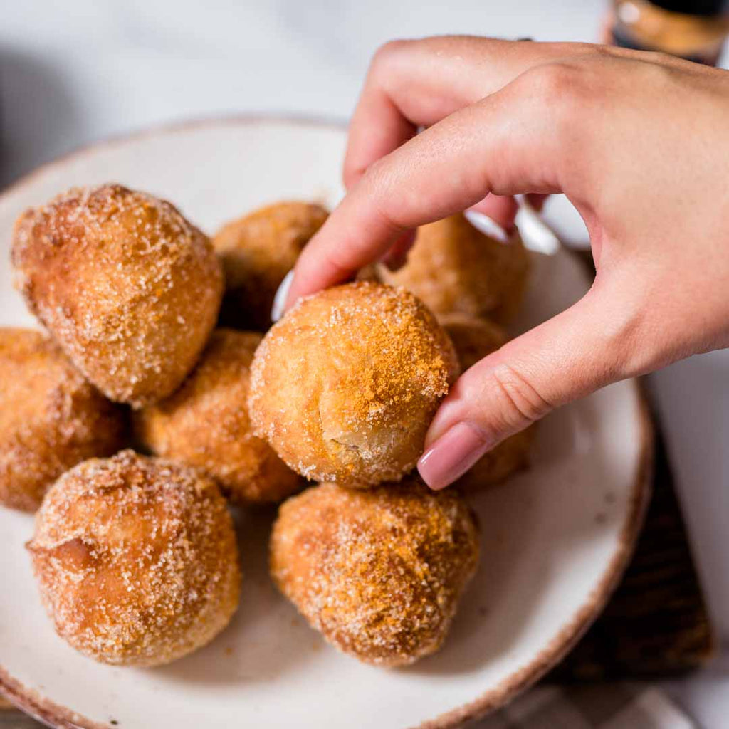 - Pinch off small golf-ball-sized pieces of dough and roll into balls. Once oil is hot enough that a tiny piece of dough sizzles when dropped in, carefully place the dough balls in the oil and fry in batches.