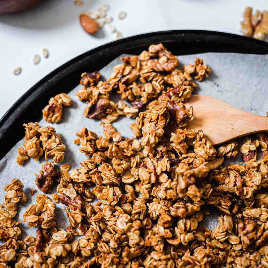 This vegan maple bacon granola is so easy and delicious, you’ll never buy ready-made granola again! With crunchy nuts, sweet maple notes and a hint of bacony goodness, you’ll have to stop yourself from eating the whole batch! Make it ahead of time and keep it in an airtight container so you always have some on hand.