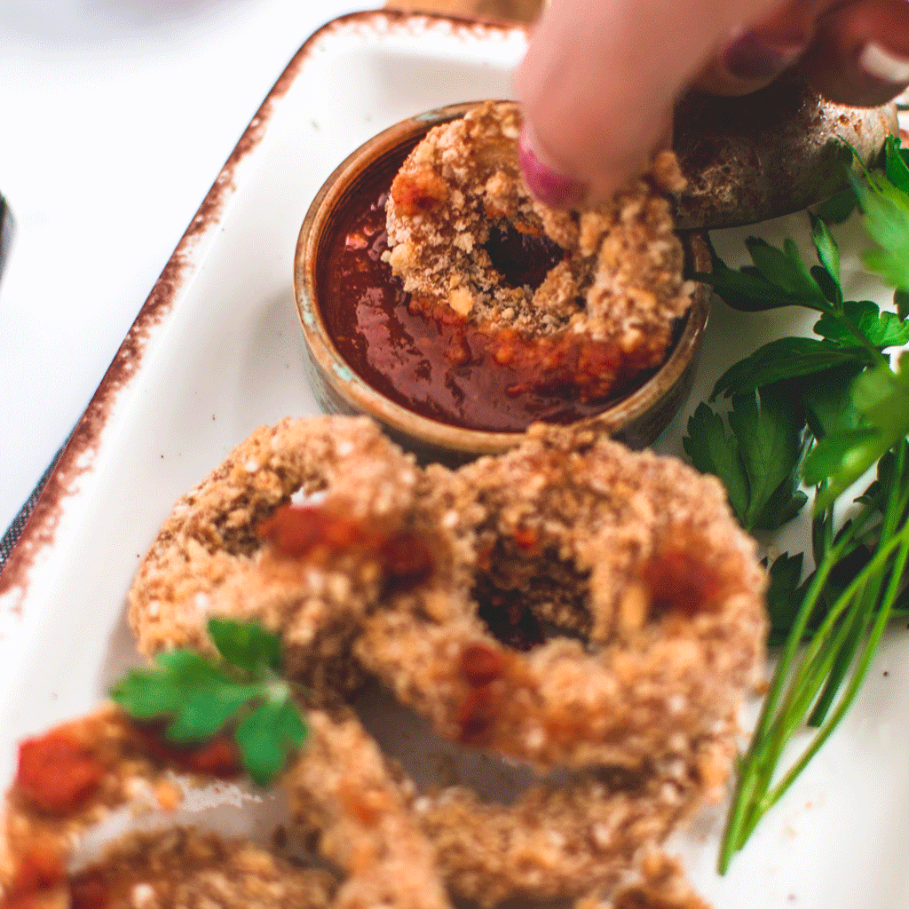 Forget the golden arches, try these golden rings with our heavenly Sriracha ketchup! Crunchy, oil-free and incredibly addictive, you’ll be making these more often than you think!